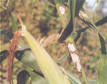 癥狀 紋枯病(俗稱"花腳稈""爛稈瘟")是近年來發生危害日益嚴重的一種新病害。四川省各地均有發生,以高溫、高濕條件下和夏播玉米發病較嚴重。其寄主甚廣,除危害玉米外,還可侵染水稻、小麥、大麥、高粱、棉花、大豆等多種作物。該病主要危害葉鞘,也可侵染葉片、苞葉和果穗,玉米拔節至成熟期均可發病。開始從莖基部的葉鞘感病,后侵染葉片并向植株上部蔓延。發病初期,光出現水漬狀灰綠色圓形或橢圓形病斑,后轉為白色至淡 黃色,發病后期,變為紅褐色云紋狀斑 塊。當濕度較大時,病斑上常長出許多白霉(菌絲和擔孢子);當溫度較高或植株已老健不適合病菌擴大危害時,即產生菌核,多藏于葉鞘內。菌核初為白色,老熟時呈褐色。葉鞘受害后,葉片萎蔫,嚴重時整株枯死,果穗受害后,可使苞葉干枯,果穗腐爛。